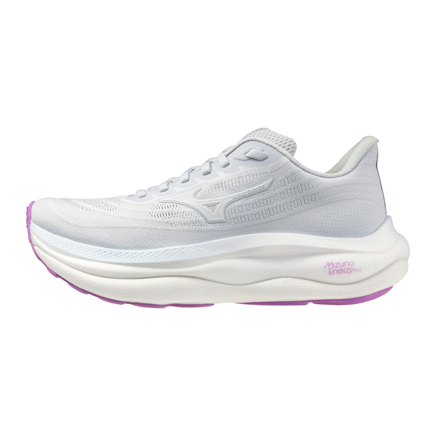 By integrating NITROGEN INFUSED MIZUNO ENERZY NXT into the midsole and increasing its thickness by 6 mm in the forefoot and 4 mm in the heel, both cushioning and energy output have been significantly enhanced. The use of FOAM WAVE and a wider outsole design provides stability while delivering a floating running experience that feels like you are gliding on air.